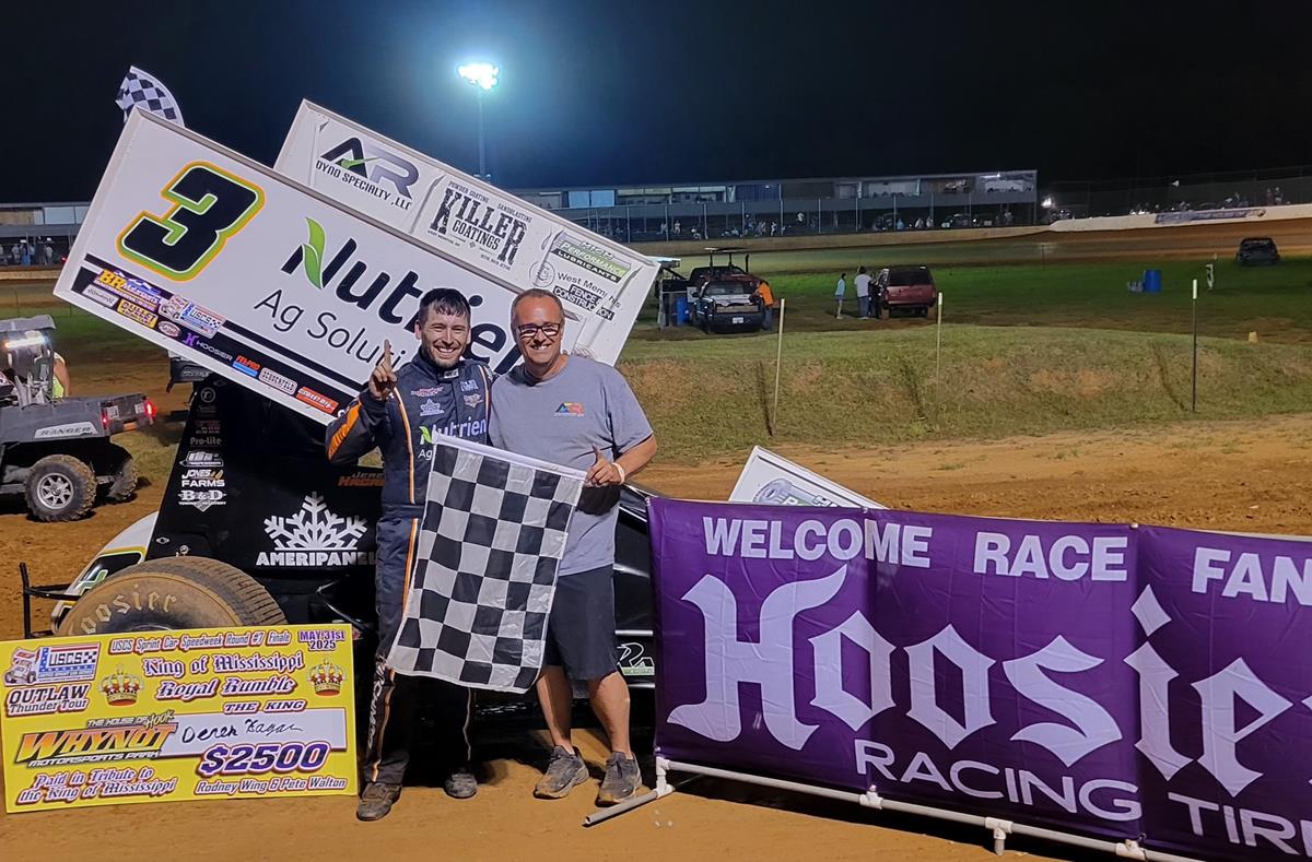 Wins by Derek Hagar of Marion, AR bookended the 20th Annual United Sprint Car Series Presented By Hoosier Racing Tire Speedweek action and Mother Nature won the five races in between. After winning the opener on May 23 at Benton Speedway in Benton, MO, Hagar won the 30-lap finale on Saturday night at Whynot Motorsports Park to take his third straight Speedweek title.
